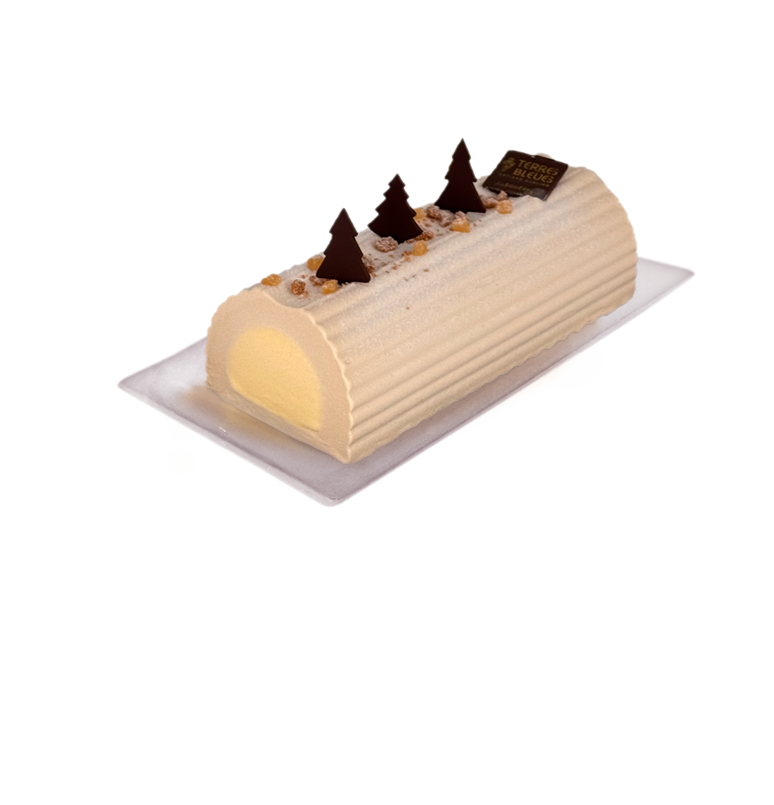 Cette bûche glacée est composée d’une crème glacée au biscuit Speculoos (65%) et d’un sorbet “plein fruit” à la mandarine de Sicile (35%), décorée de chocolat noir, de pépites de fruit à l'orange et d'éclats de speculoos.