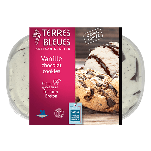 Une crème glacée à la vanille onctueuse, marbrée d'une généreuse sauce au chocolat et parsemée d'éclats de cookies. La sauce au chocolat est préparée par nos soins et les cookies sont de fabrication artisanale locale. Cette association gourmande a été concoctée spécialement pour les 20 ans de Terres Bleues, et revient en « Edition limitée » à l'automne et jusqu'à la fin de l'hiver... A (re)découvrir sans attendre !